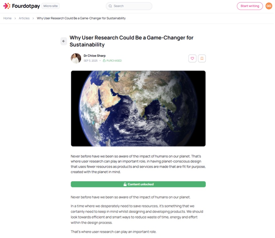 Let’s say that a reader is interested in your article and wants to read it in full. To do so, a reader must purchase the article to unlock the rest of the content by clicking ‘Buy Article’. A Fourdotpay wallet popup will appear.