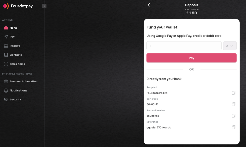 To deposit funds to your wallet, simply select ‘Deposit’. Enter the amount you want to deposit and click ‘Pay’ if you want to deposit funds using Google Pay, Apple Pay, or credit/ debit card. Alternatively, make a bank transfer using the details provided.