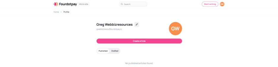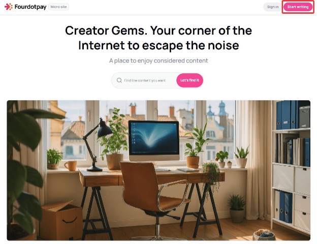 On gems.fourdotpay.io, create a user profile by clicking ‘Start writing’.