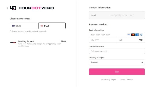 When choosing to pay with Google Pay, Apple Pay, or credit card, you simply provide your details e.g. credit card details, click ‘Pay’, and the funds will appear in your wallet.