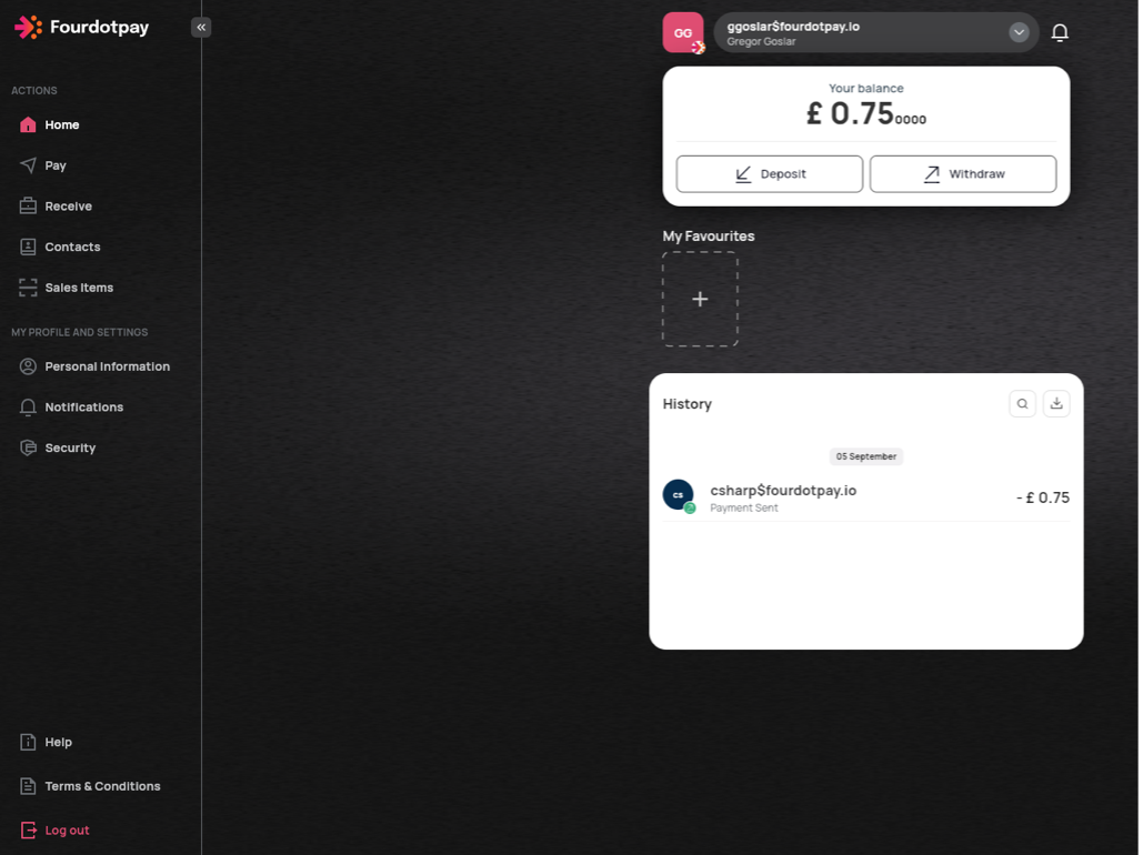Send a payment from your account to any other active Fourdotpay account. This can be done in several ways by typing in the destination Fourdotpay ID, selecting a Fourdotpay ID from your contacts list, capturing a static or dynamic QR code created by a Fourdotpay wallet holder, or responding to a request from a Fourdotpay wallet holder.
