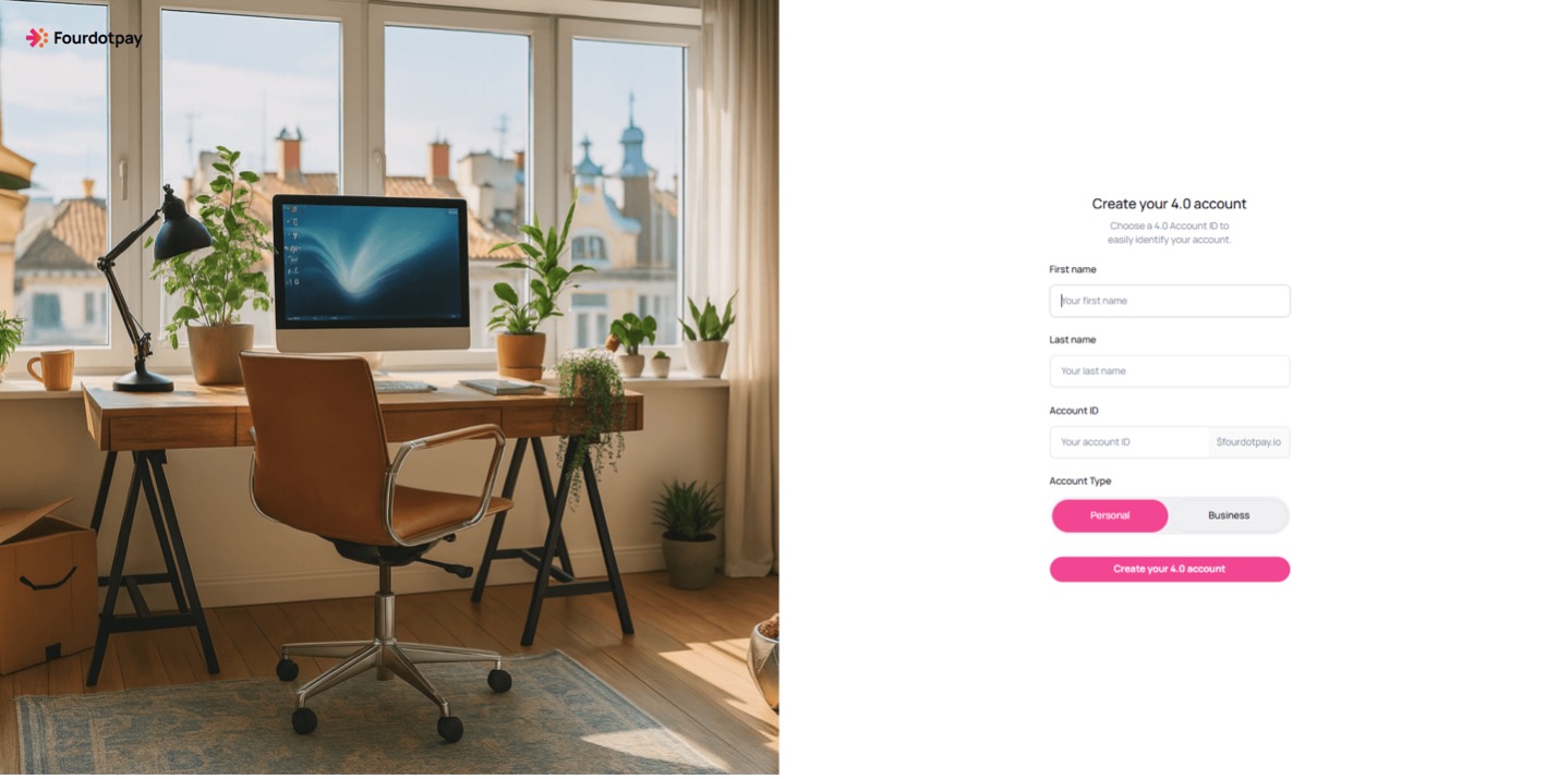 Once you’re verified, you are asked to provide your first name, last name, your account ID, and select whether this account will be used for personal or business use. When you have provided all the requested information, click ‘Create your 4.0 account’.