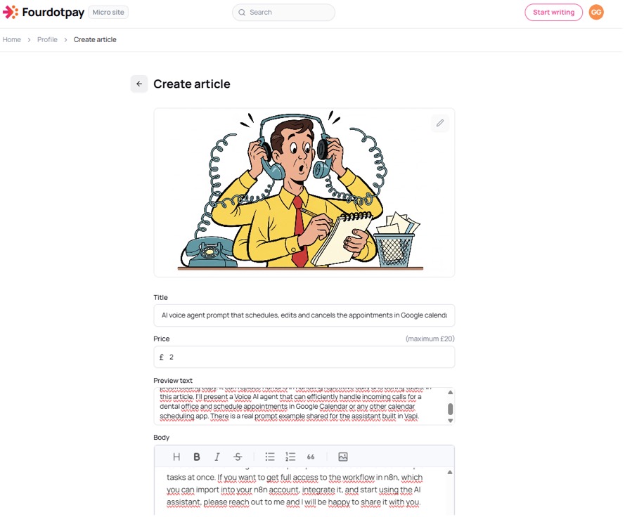 Write and format articles and enhance them with images, compelling titles, and engaging preview text. If something comes up in between, there is also an option to save a draft and continue editing the content later. Don’t forget to set the price. Once you are satisfied with your article, simply set the status to ‘Published’ and click ‘Create Article’.